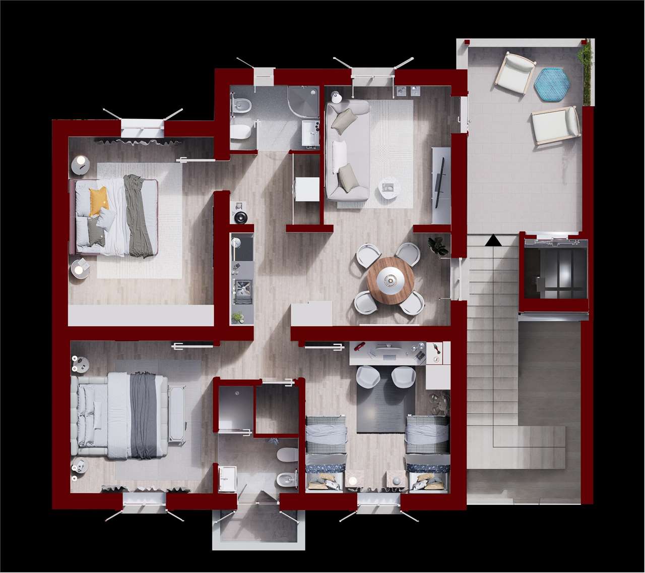 L’immobile, di dimensioni leggermente più contenute rispetto al piano terra, offre però un importante valore aggiunto: la possibilità di sfruttare la soffitta, ampliando o valorizzando gli spazi abitativi secondo le proprie esigenze.