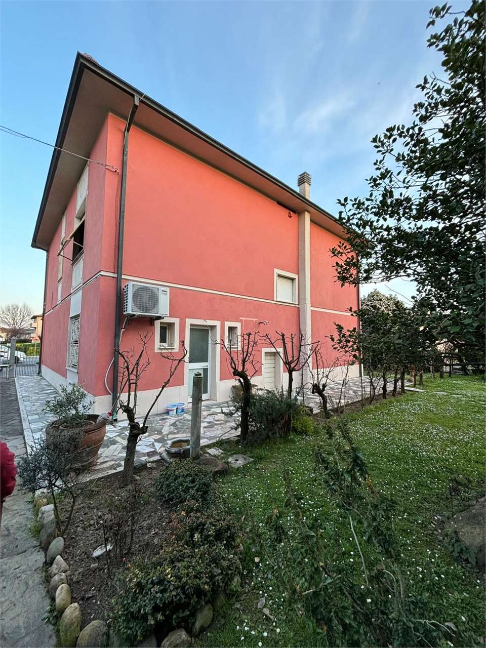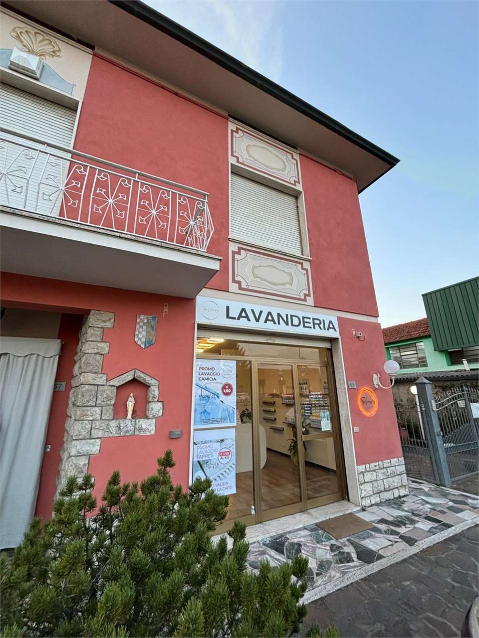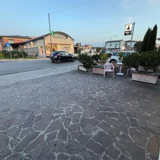 Esternamente l’immobile vanta un generoso giardino e un ampio piazzale fronte strada, ideale per il parcheggio della clientela.