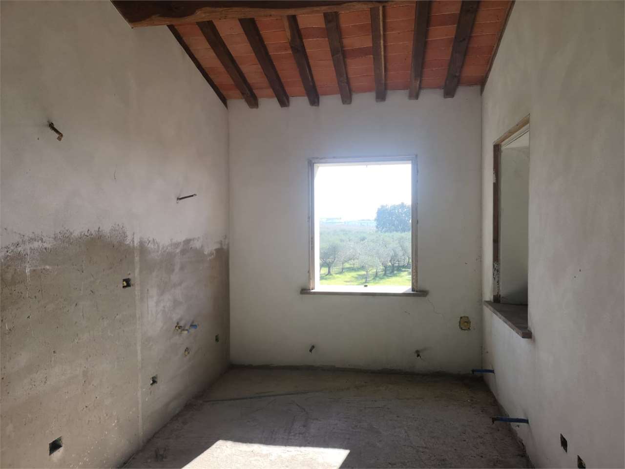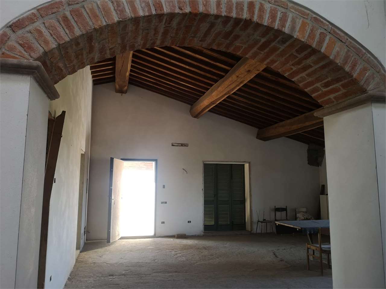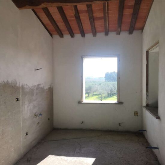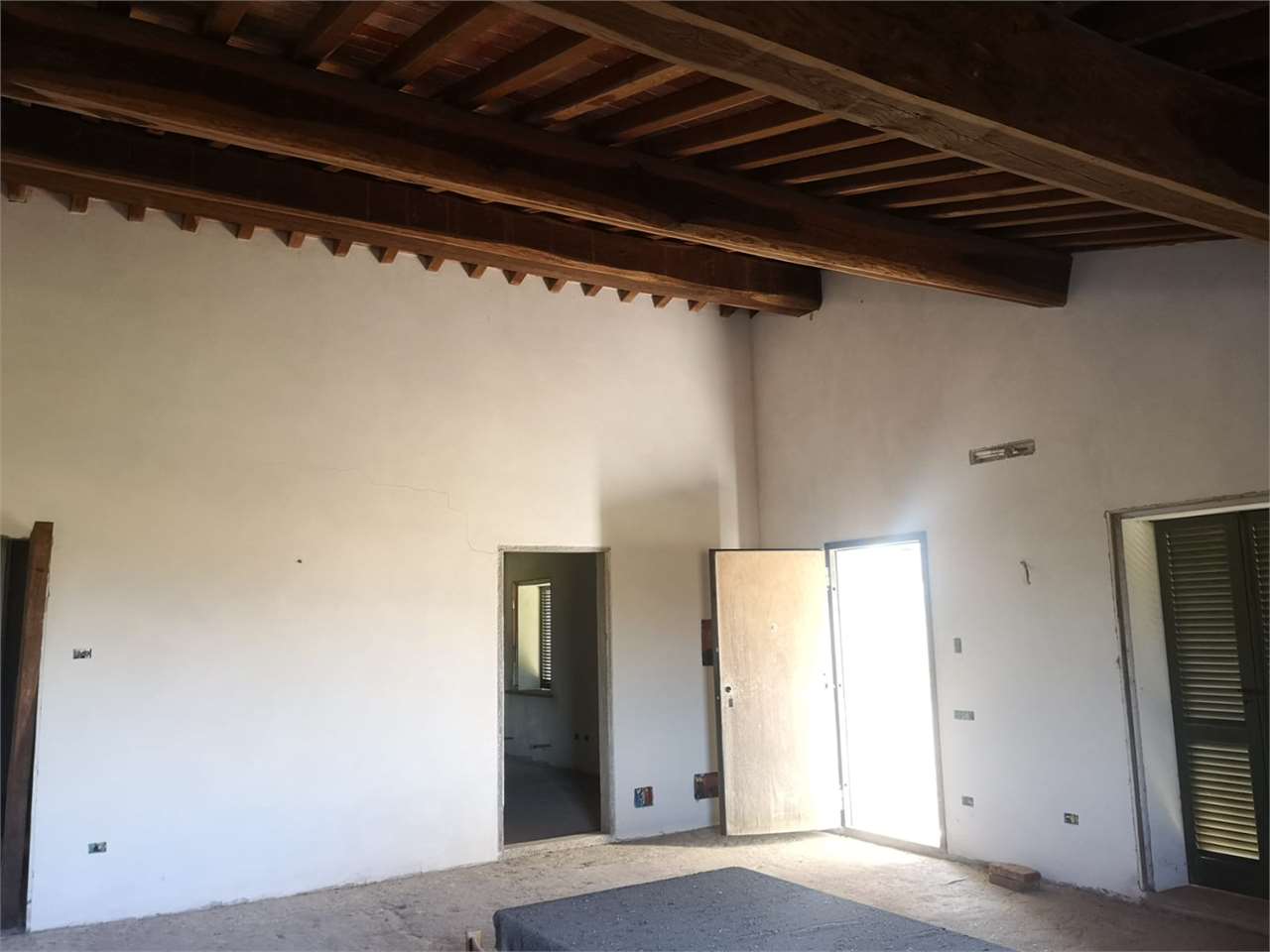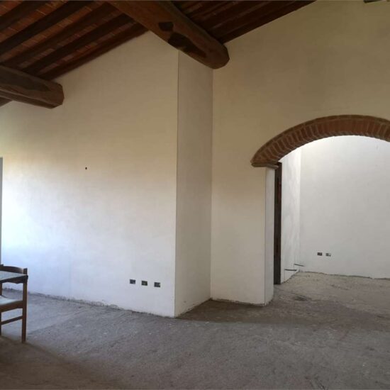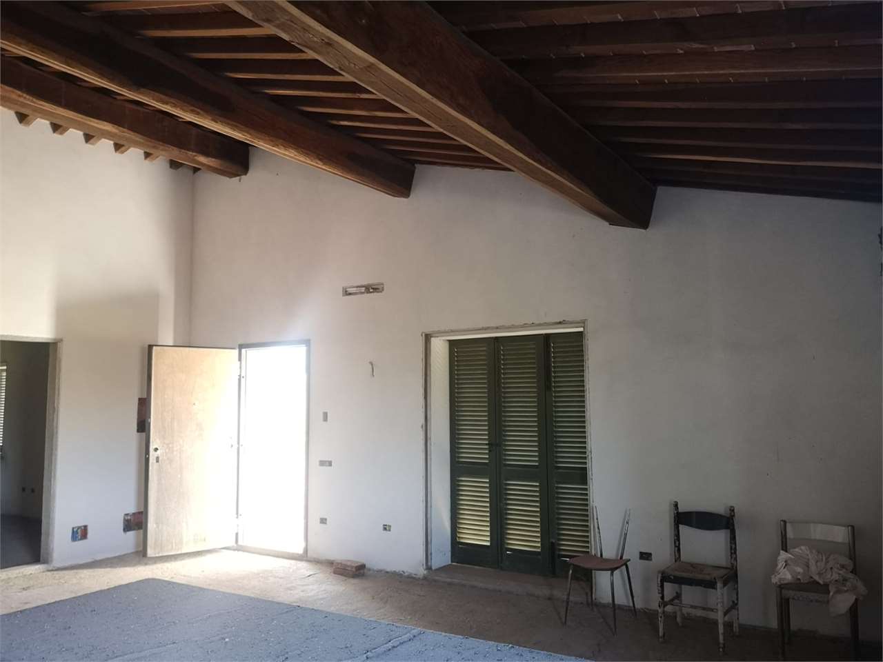 Al piano primo, al quale si accede da una pratica e bella scala rustica esterna, posta sul lato ovest del fabbricato, troviamo un ampissimo e luminoso locale soggiorno con predisposizione per il camino, cucina abitabile, bagno con finestra, camera matrimoniale con bagno en suite, camera singola e lavanderia, il tutto incorniciato da un altissimo soffitto con travi a vista.