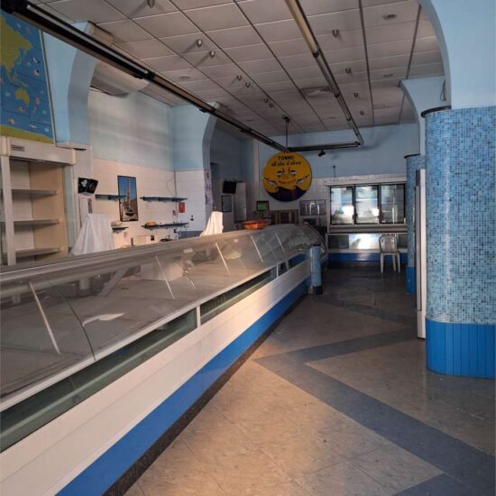 L’immobile, precedentemente utilizzato come negozio di genepesca, attualmente si presenta come un unico grande fondo, con due accessi da due strade parallele e con possibilità’ di suddividerlo, ottenendo due fondi separati di simile metratura di circa 150 mq l’uno.